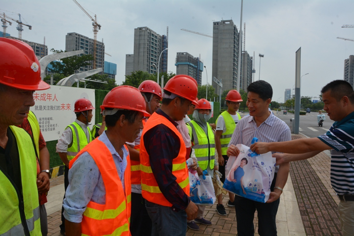 7月26日上午,開發(fā)公司副總裁劉建華帶隊慰問市政工程項目現(xiàn)場工人,給他們送去毛巾、香皂、洗發(fā)水等防暑降溫用品,感謝他們對園區(qū)市政工程的建設作出的貢獻。