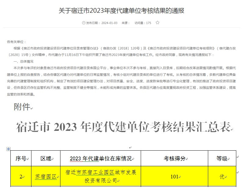近日,經市政府同意,由宿遷市政府投資建設項目代建管理辦公室通報宿遷市2023年度代建單位考核工作結果,城發(fā)公司以101分高分通過本次考核。